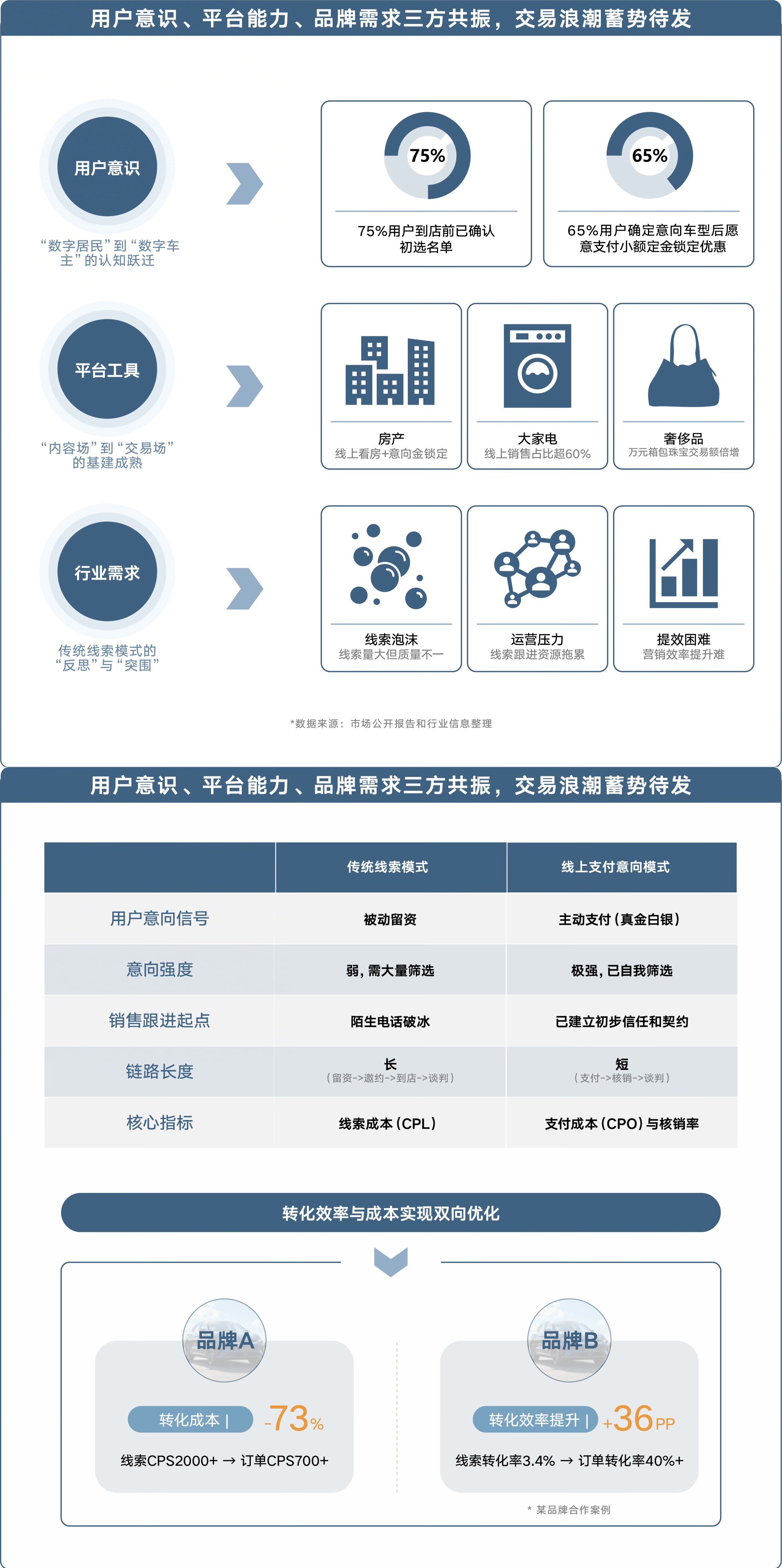 首先,用户侧,购车决策已深度数字化,75%的用户在到店前已锁定初选名单,65%的用户愿意支付千元小额定金,锁定意向车型和优惠,从“数字居民”到“数字车主”的认知跃迁基本完成。