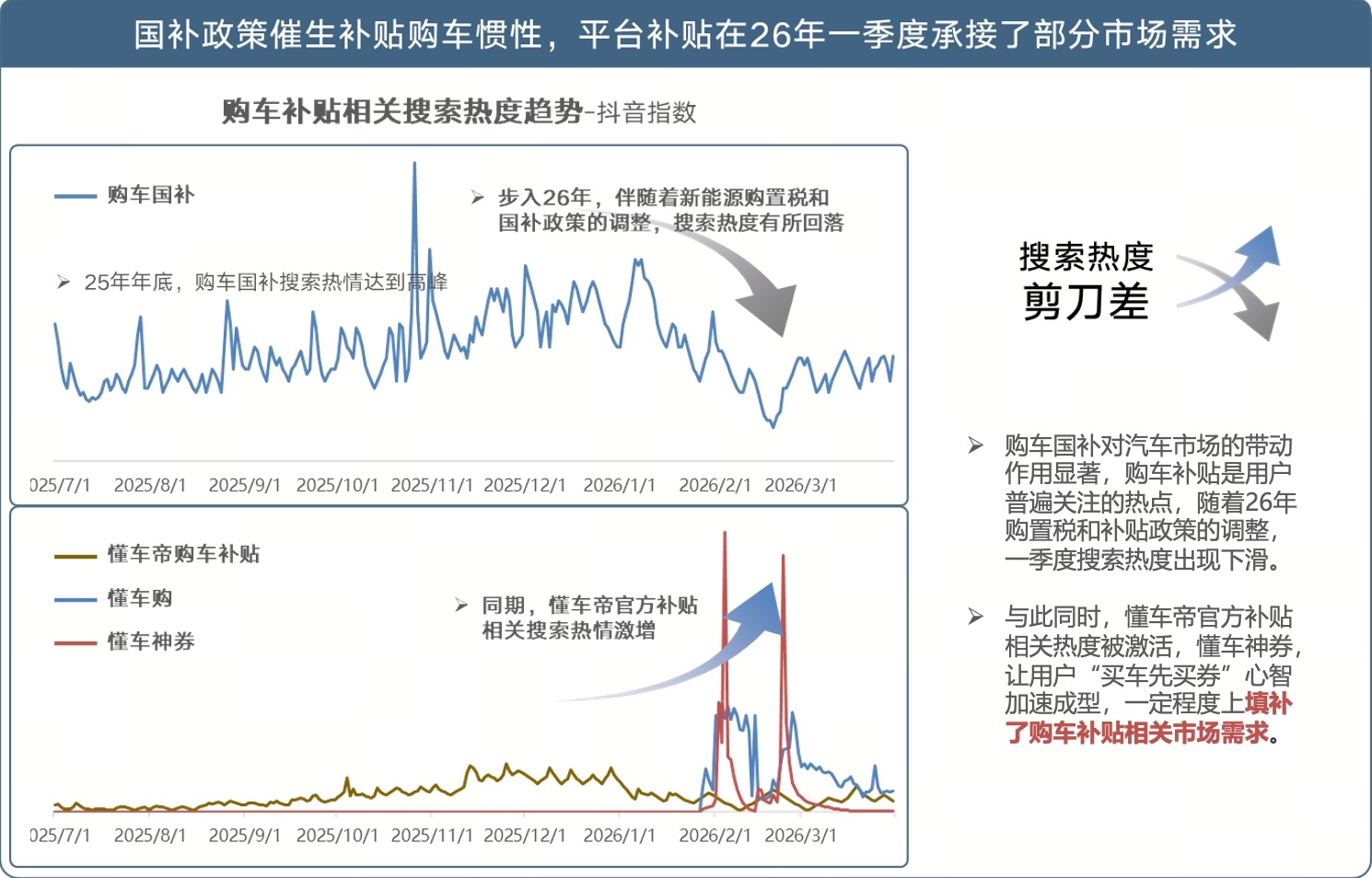 国补是汽车市场的重要驱动力,从抖音搜索趋势看,“购车国补”相关热度在25年下半年持续走高,可见用户对政策性补贴的高度敏感。步入26年,随着新能源购置税和以旧换新补贴的政策调整,相关热度有所回落。在这一窗口期,“懂车帝购车补贴”的搜索热度被快速激活,懂车神券,让用户“买车先买券”心智加速成型,与国补热度形成“此消彼长”的承接态势。平台级购车补贴正逐步填补市场需求,成为用户购车决策中的补充选项。