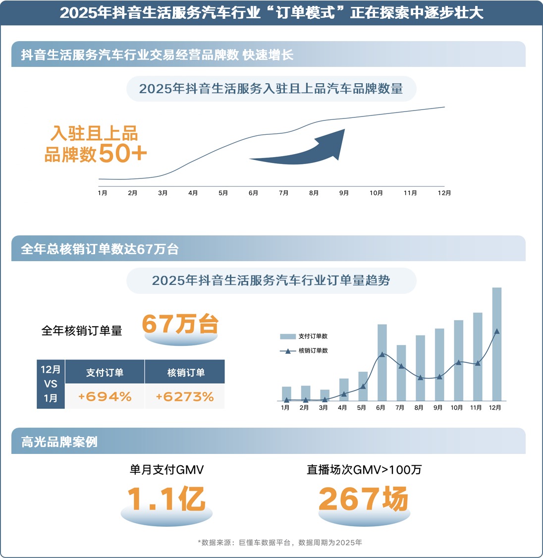 2025年,抖音生活服务汽车交易线上化正从试水逐步走向规模化验证。入驻且上品汽车品牌数量稳步增长,行业参与度持续升温。全年总核销订单数达67万台,增长曲线年末翘尾效应显著,用户对“先购券、再买车”模式的接受度快速攀升。