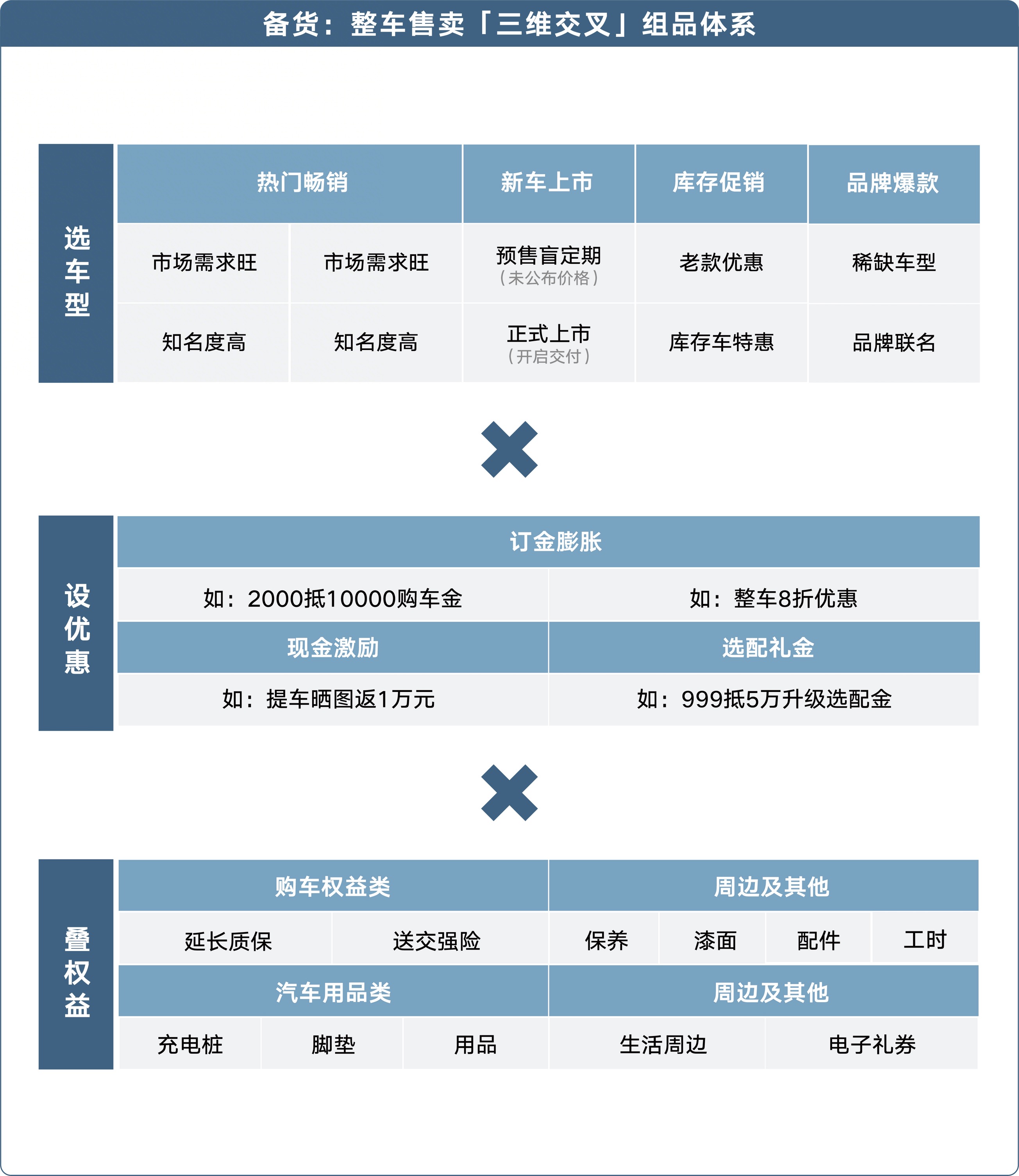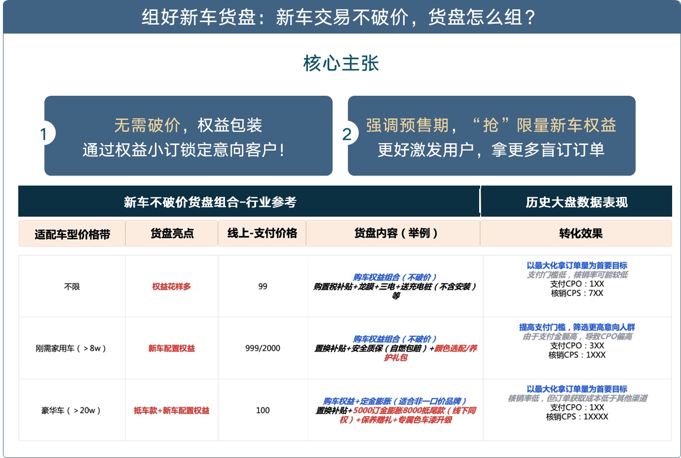 从大盘历史数据看,不同价格带的车型可采取差异化的货盘策略,核心逻辑是:不破价,但通过权益组合制造“超值感”,让用户愿意为优先提车、专属配置、增值服务支付意向金,从而实现新车上市期的意向客户提前锁定与有序转化。