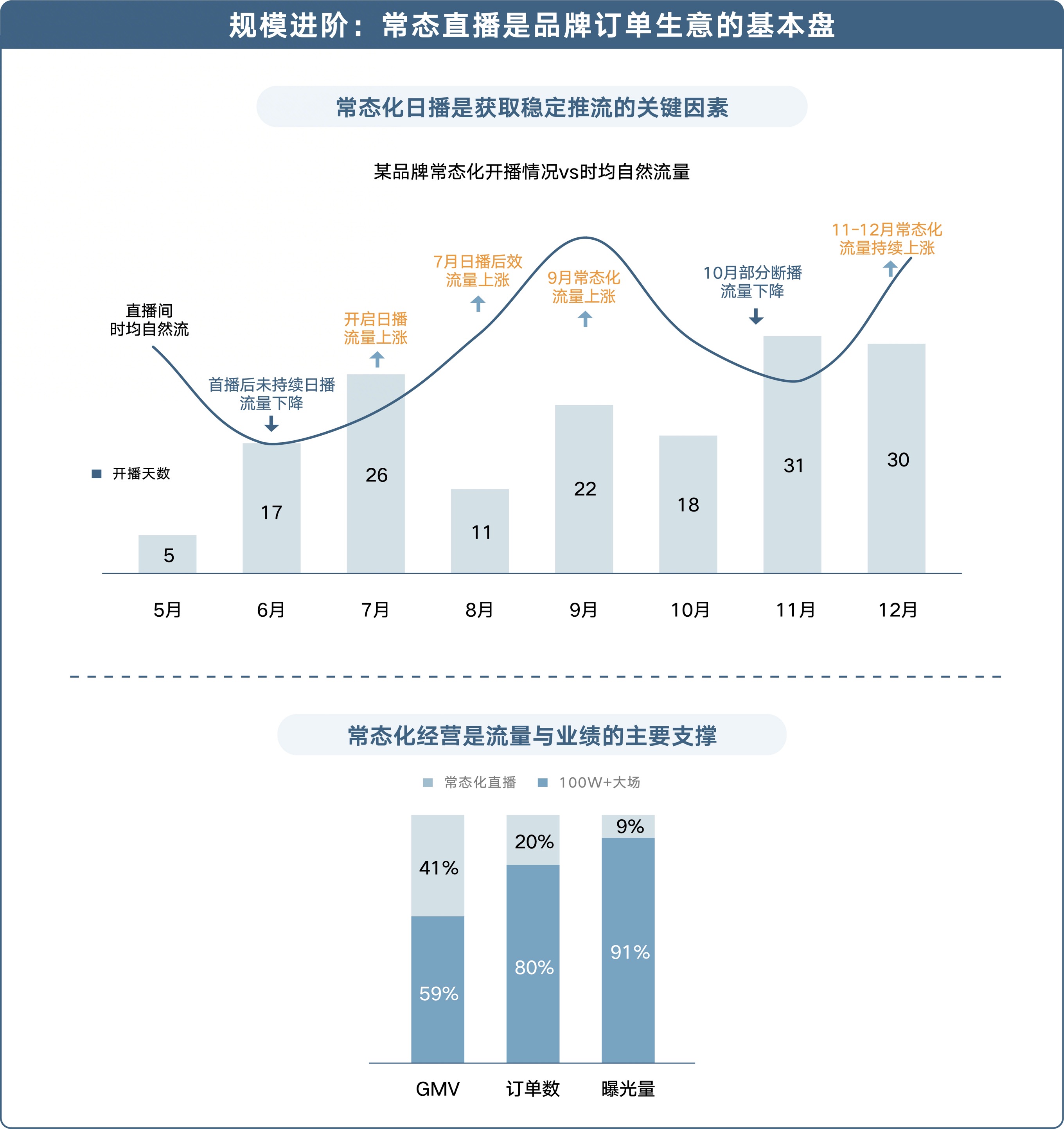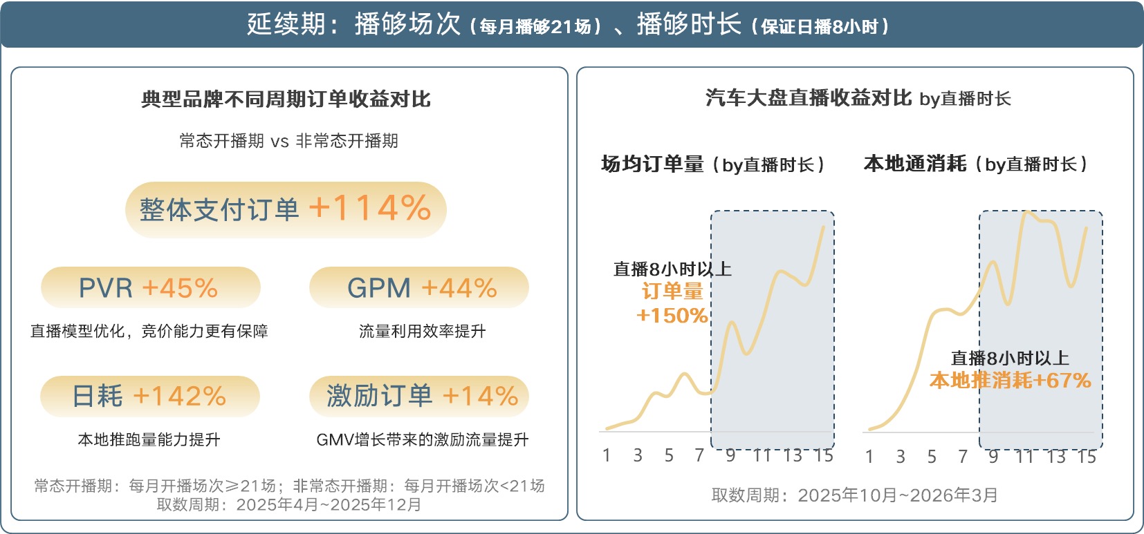 首先是坚持常态化直播,保证场次与时长。 数据表明,品牌常态化开播期间,除了获取更多订单,转化效率和放量空间均更优,GMV增长带来的激励订单也更多;此外稳定的开播时长也很重要,单场开播超过8小时的直播间,拥有更多的订单空间和放量潜力。延续期不仅要“坚持播”,也要“播得久”——通过足够的开播时长,获得更充分的流量利用效率和订单转化能力。