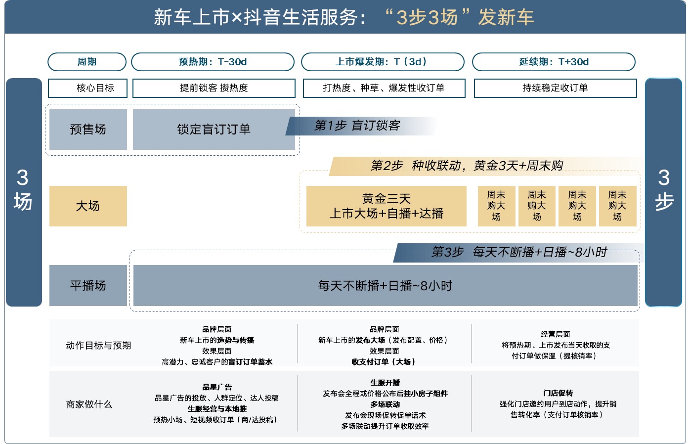 新车上市是主机厂最重要的营销场景,也是交易线上化能力最具价值的应用阵地。基于抖音生活服务的实践,我们提炼出“3步3场”的新车上市打法,将交易线上化贯穿预热期、上市爆发期、延续期三个阶段的营销策略。