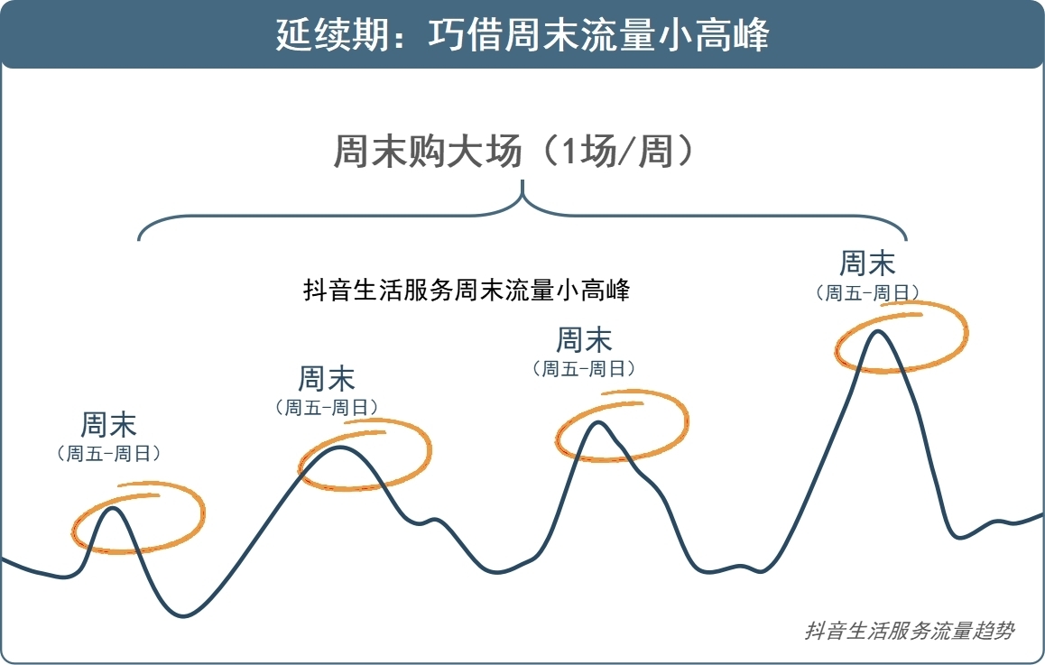 其次是巧借周末流量小高峰,每周一场“周末购”大场。 抖音生活服务流量在周五至周日呈现周期性小高峰,品牌应在此窗口集中资源,以每周一场周末购大场的节奏,持续种收。周末购不是简单的平播,而是利用周末用户活跃度高的特点,配合专属权益和适度投流,形成“一周一小爆”的稳定脉冲,确保新车在上市后一个月内持续有订单入账。